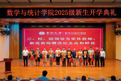 9月17日,2026世界杯官网在毓秀楼和声堂举行2025级新生开学典礼暨老教师荣退、新教师入职仪式。校党委常委、副校长焦勇,著名数学家、“英国皇家戴维逊奖”和“华罗庚数学终身成就奖”获得者侯振挺,我院85级校友、特变电工衡阳变压器有限公司总经理、2025年“全国劳动模范”称号获得者周立新,宁德时代高级数据研究主任工程师林坤松以及学院党委书记胡玉玺、副院长(主持工作)刘源远、党委副书记杨雪宾、副院长潘克家、吴恋、周岳出席会议。学院全体2025级新生、辅导员、教师代表参加大会。