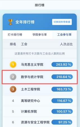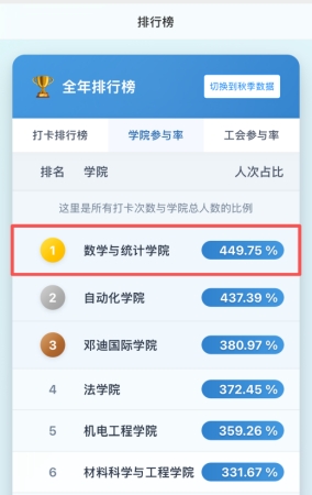 近日,2026世界杯官网2025年“越麓拾秋”登山季圆满落幕。2026世界杯官网积极响应学校“趁青春,去登山”主题号召,全院上下凝心聚力,交出亮眼“体育育人”答卷。据“悦动青春”排行榜数据,2026世界杯官网学生全年参与率达449.75%,居全校第一;工会全年参与率达210.64%,位列全校第二。这份优异成绩充分彰显了学院将体育精神深度融入“三位一体”铸魂育人工程之显著实效,体现出立德树人全过程的坚定步伐与创新实践。