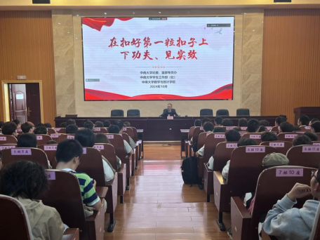 杨书记要求青年学子要坚定理想信念,扣正“第一粒扣子”,培养正确的价值观念,促进自身全面发展,重点强调了大学生要严守纪律规矩,从谨守考试诚信,远离信贷陷阱,恪守学术道德,规范举止言行,遵守法律法规五个方面展开,告诫同学们“勿以恶小而为之,勿以善小而不为”。杨书记还通过我院侯振挺、刘路教授等专心求学、潜心科研的优秀事例,勉励同学们要厚植爱国情怀,践行使命担当,矢志青春奋斗,勇于担当奋斗。全体同学要坚持以好奇为导、以学习为本、以兴趣为基、以实干为要,不断发展自我,练就过硬本领,报效伟大祖国。