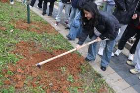 “撸起袖子加油干”!志愿者们撸起袖子,扛起锄头,向脚下的土地狠狠砸去。看似简单的工作却是一个体力活,硬土坚石全不怕,一锄又是一锄来。以人多力量大之势,成功刨出了一个个完美的深坑。
