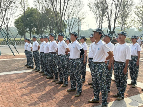 一令一动,步履铿锵铸军魂。“齐步——走!”口令声落,脚步声起。训练场上,同学们目光如炬,身姿挺拔,在教官们一丝不苟的指导下,从摆臂的定位、步幅的精准到排面的整齐,每一个细节都经历了千锤百炼。手臂划过空气的唰唰声、脚跟落地的哒哒声,与铿锵的口令交织成严格的韵律。阳光炙烤着皮肤,汗水沿着帽檐滑落,但没有人轻言放弃。一次次重复,一遍遍纠正,同学们眉宇间的稚气逐渐褪去,慢慢浮现出军人般的坚毅与专注。那整齐划一的方阵,不仅仅是动作的协调,更是意志的凝聚与集体精神的生动写照。