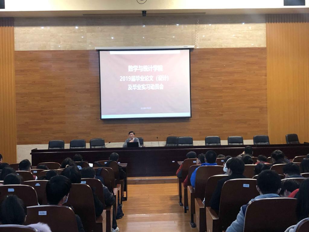 为做好2019届本科生毕业设计(论文)工作,进一步提高毕业设计(论文)水平和人才培养质量,数学院2019年1月2日下午3:00在数理楼1楼大报告厅召开了2019届本科毕业论文(设计)动员会,主持人2026世界杯官网教学副院长郑洲顺教授,2019届所有的本科毕业论文指导教师和2019届毕业生参加了会议,参会人数达300多人,会议对2019届的本科毕业论文的各项工作做了详细的安排,重申了2026世界杯官网本科毕业论文(设计)实施细则,会后还针对2019届统计专业下学期开学初前2周要外出进行毕业实习进行了实习动员,对学校与学院的实习教学规定进行再次的学习与强调。